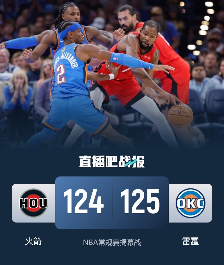 首节之争两队状态相当单节12次互换领先且分差仅在一个球之间,亚历山大在火箭的高压防守下出手机会不多,反倒是霍姆格伦接管进攻端大任单节5中5砍下13分;杜兰特的火箭首秀中首节同样取得8分;次节末段火箭曾依靠11-2的攻势拉开10分优势,不过最后米切尔压哨3+1帮助雷霆追至6分进入下半场。休息归来火箭上来一波6-0再次拉开两位数优势,但雷霆后半段连续三分迅速追上比分;这之后火箭虽然一直保持优势但分差不大悬念留到最后,决胜时刻杜兰特错失关键罚球,亚历山大则命中投篮拖入加时。